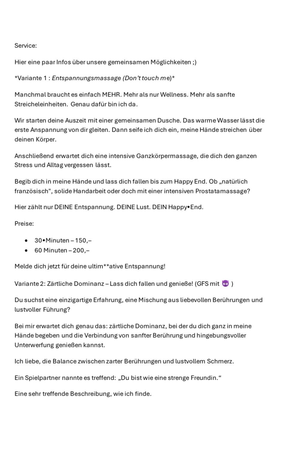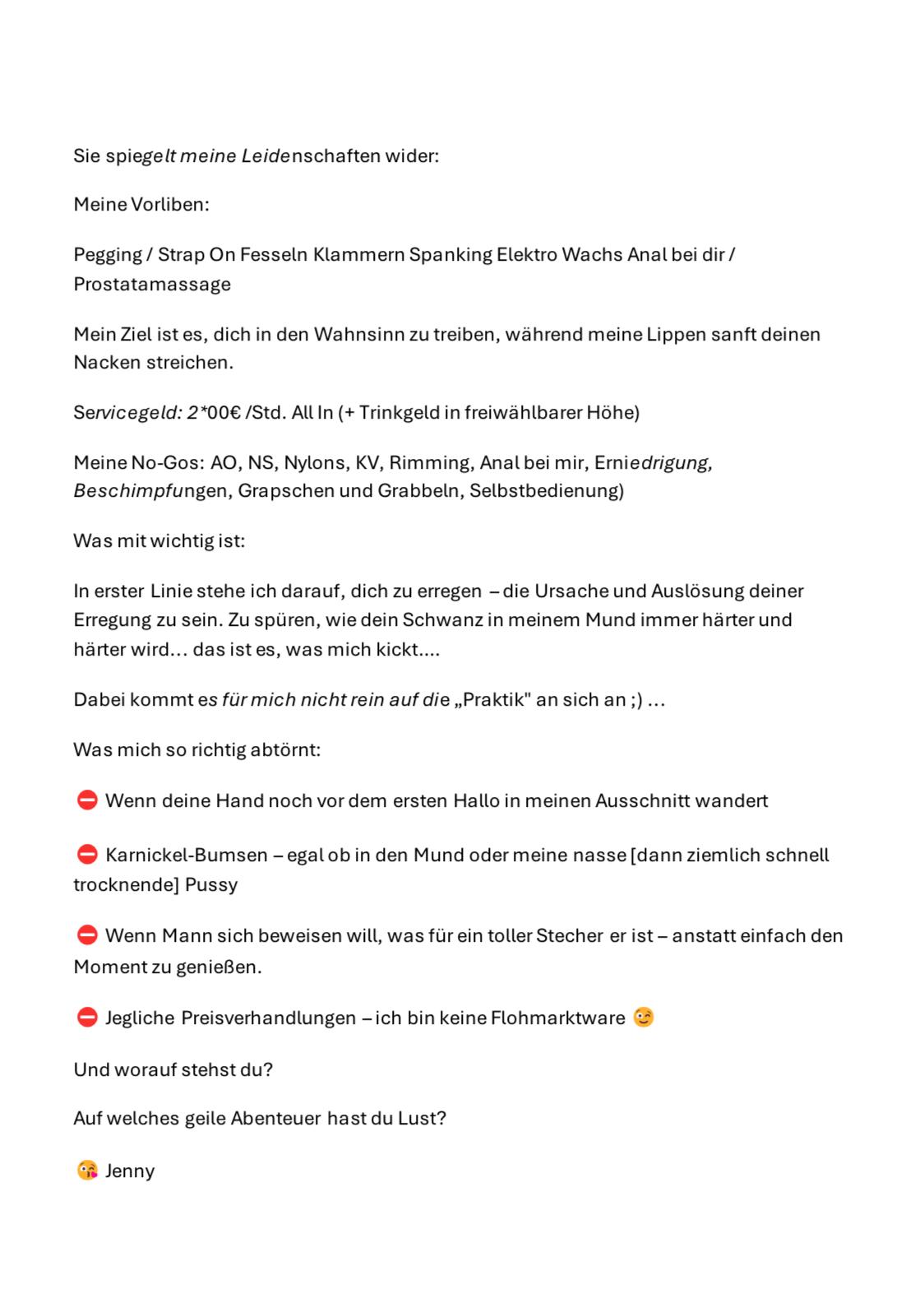 Derzeit keine Reservierung (Die hier beschriebenen Informationen zu dieser Dame, mit allen persönlichen Angaben, Service-Liste und Fotos wurde im Auftrag der dargestellten Dame erstellt.)